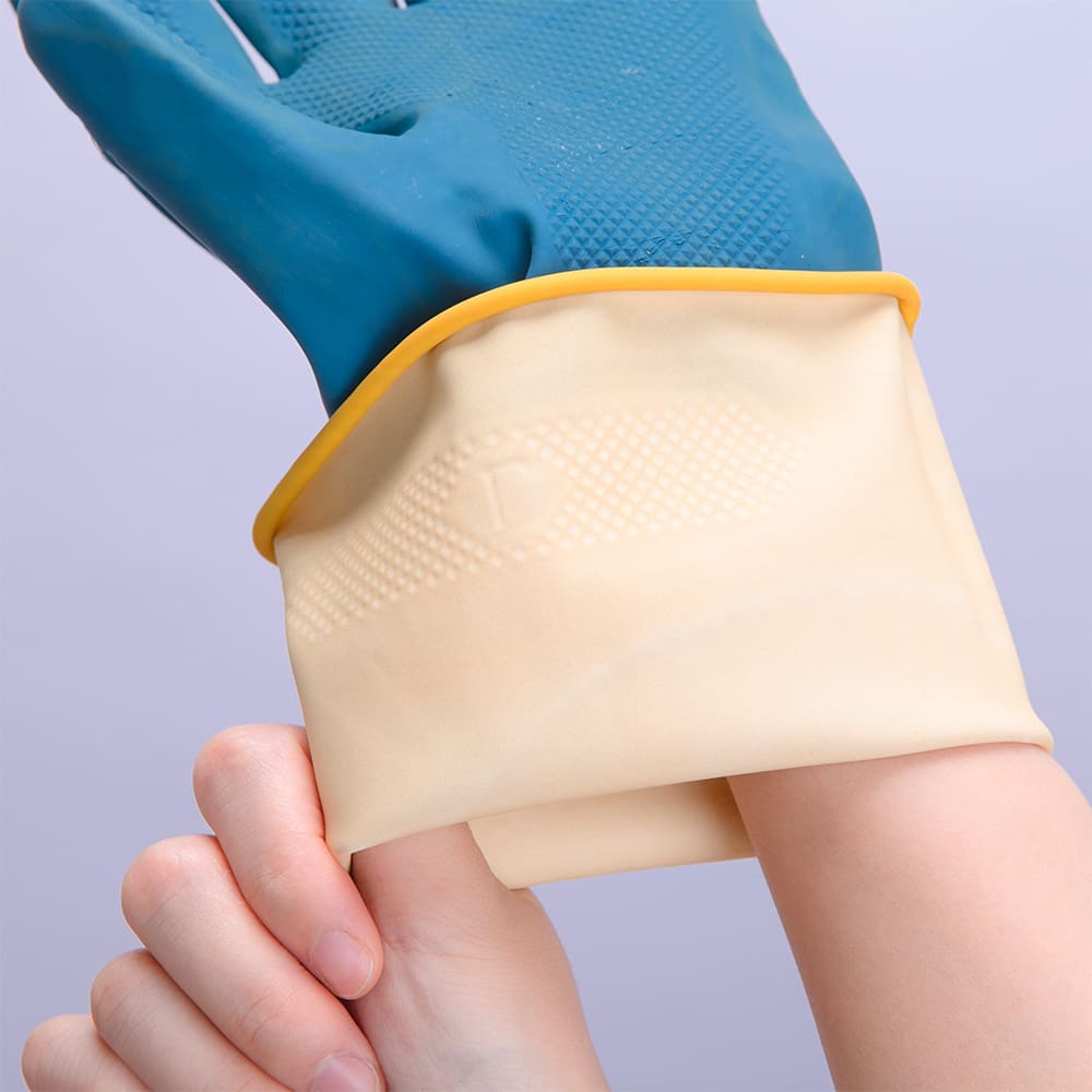 These cleaning rubber gloves have a long 13-inch (33cm) cuff that protects your wrist and lower arm from water, dirt, and cleaning chemicals. The beaded cuff makes the glove stronger and easier to put on or take off.