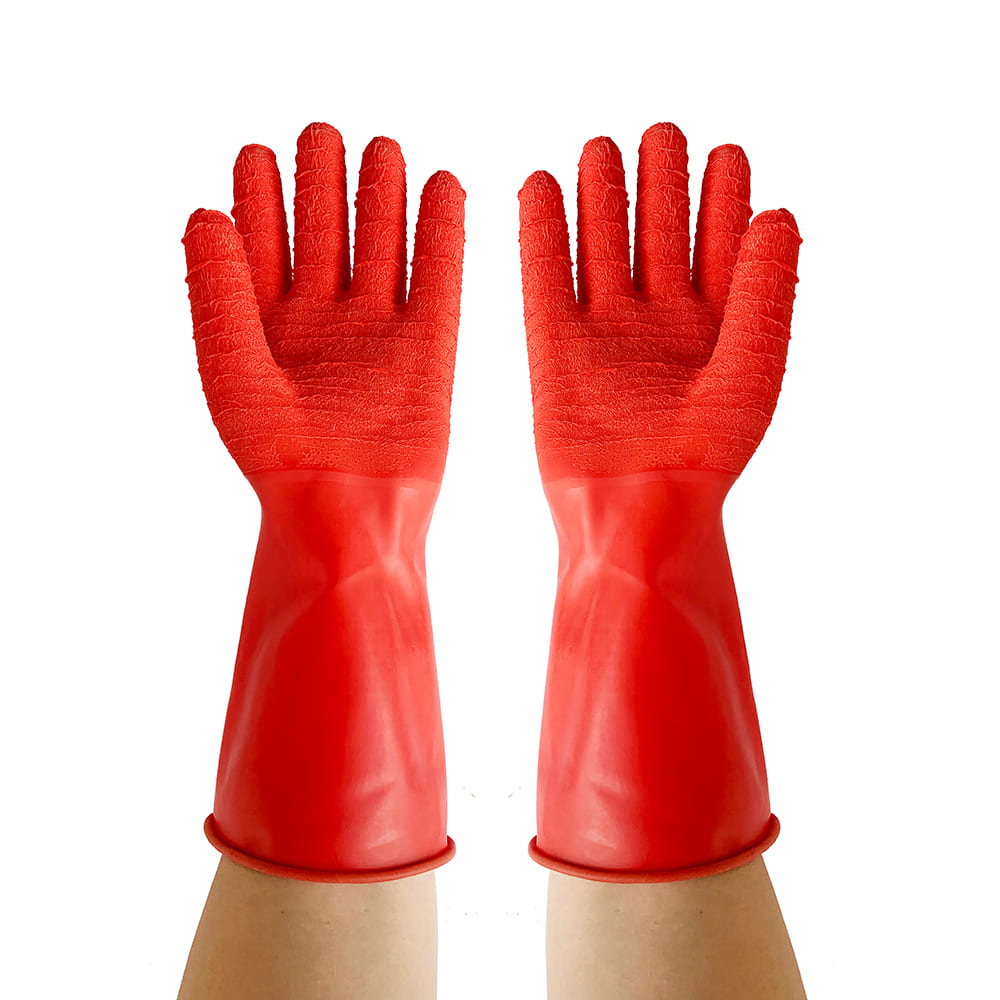 These red Food Processing Latex Rubber Gloves give strong wet grip, long arm protection, and tough, tear-resistant strength for daily use in meat, seafood, and kitchen work. Made from food-safe natural latex and BPA-free materials, they keep hands dry, clean, and safe for long hours in cold, wet food-processing rooms.